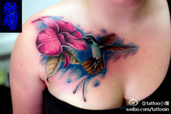 美女前胸漂亮潮流的蜂鸟纹身图案_女生纹身图案大全_纹身图吧