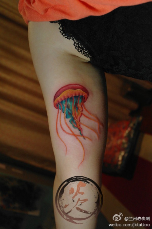 女生手臂潮流漂亮的彩色水母纹身图案_女生纹身图案大全_纹身图吧