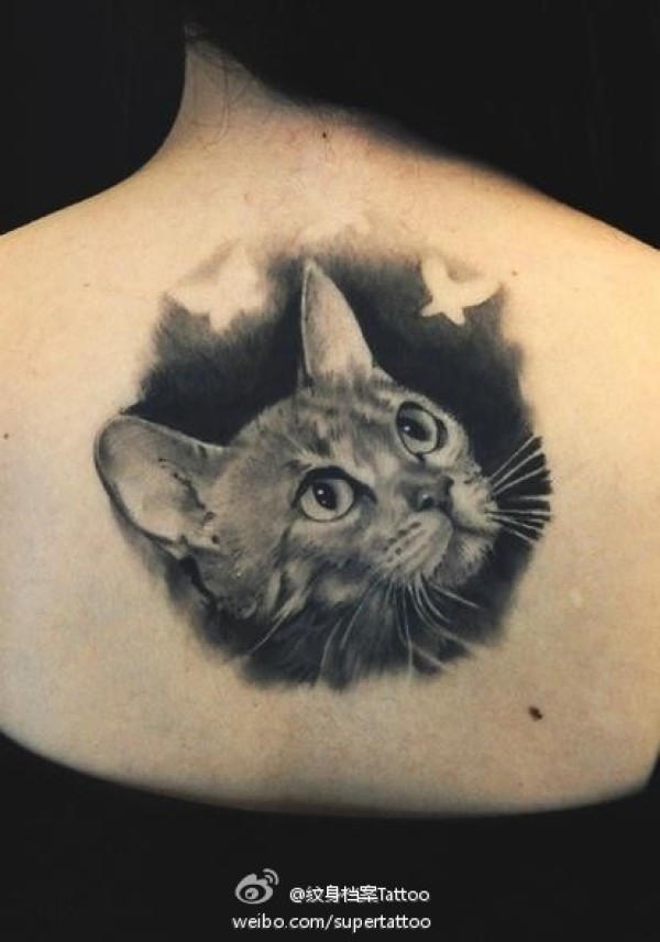 女生后背呆呆的猫咪纹身图案_女生纹身图案大全_纹身图吧