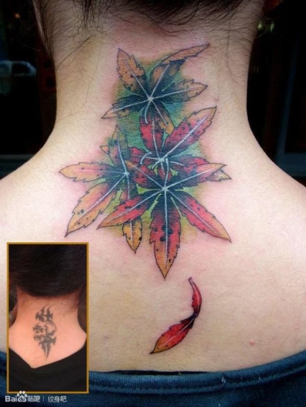 女生颈部好看的彩色枫叶纹身图案_女生纹身图案大全_纹身图吧