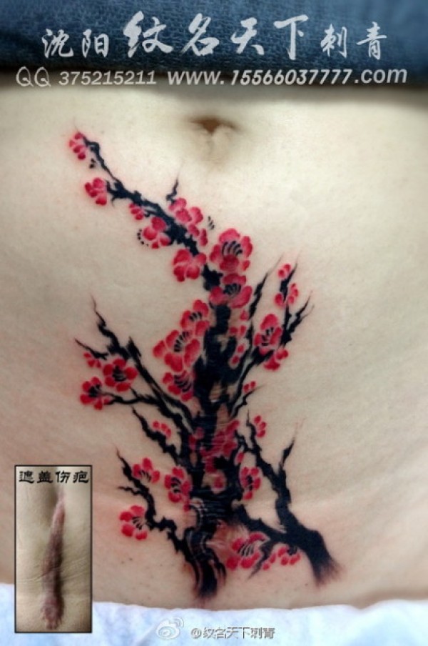 美女腹部漂亮时尚的梅花纹身图案_女生纹身图案大全_纹身图吧