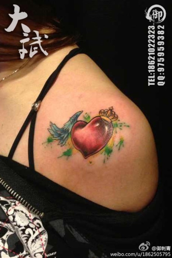 女生肩膀处好看的彩色爱心翅膀纹身图案_女生纹身图案大全_纹身图吧