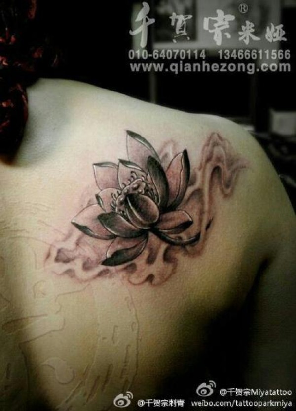 女生肩背唯美流行的黑白莲花纹身图案_女生纹身图案大全_纹身图吧