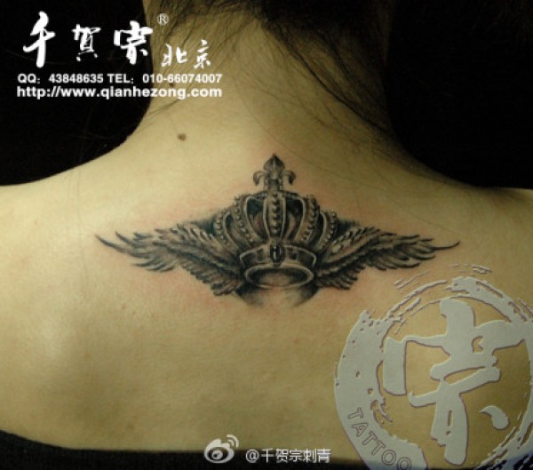 女生后背流行时尚的皇冠翅膀纹身图案_女生纹身图案大全_纹身图吧