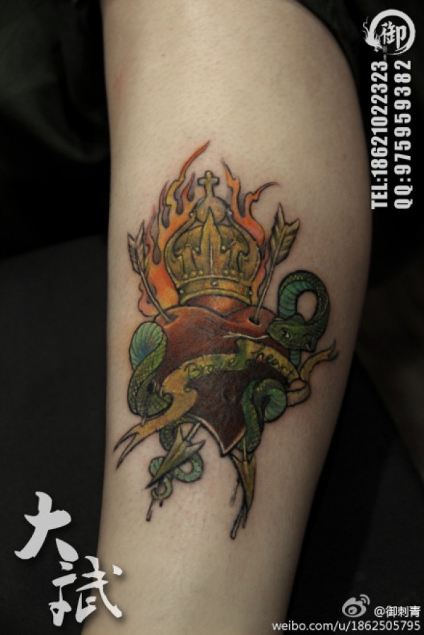 女生腿部精美的爱心皇冠纹身图案_女生纹身图案大全_纹身图吧