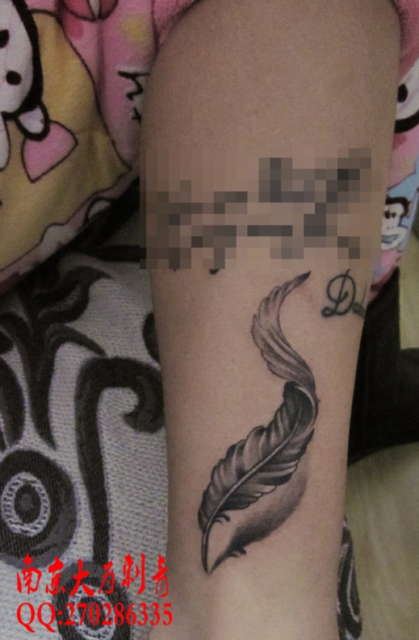 女生腿部唯美小巧的黑白羽毛纹身图案_女生纹身图案大全_纹身图吧