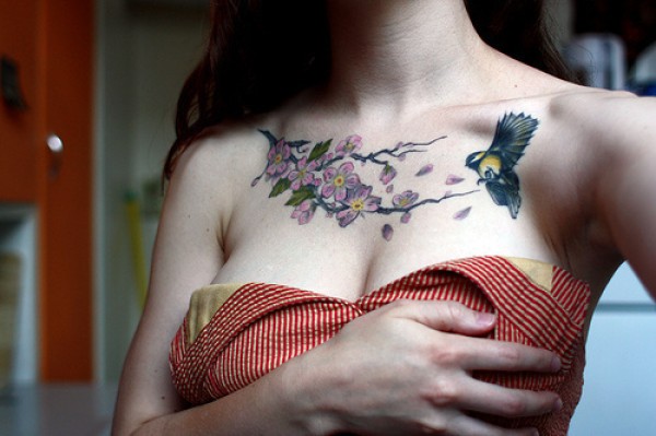 女生胸部时尚流行的小鸟与花卉纹身图案_女生纹身图案大全_纹身图吧