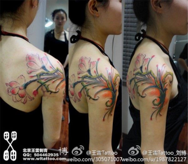 女生手臂到肩背漂亮时尚的彩色花卉纹身图案_女生纹身图案大全_纹身图吧