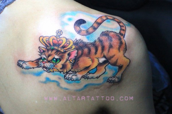 女生肩背漂亮好看的彩色猫咪纹身图案_女生纹身图案大全_纹身图吧