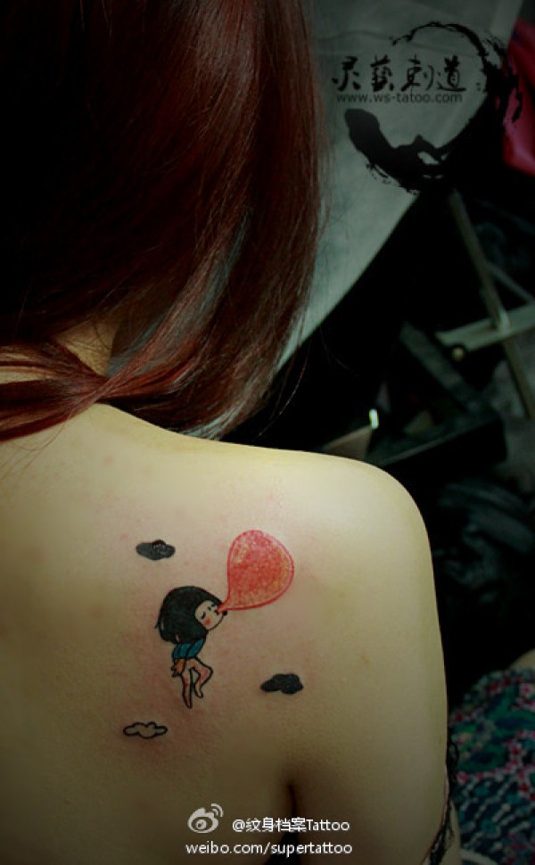 女生肩背可爱的吹气球的小女孩纹身图案_女生纹身图案大全_纹身图吧
