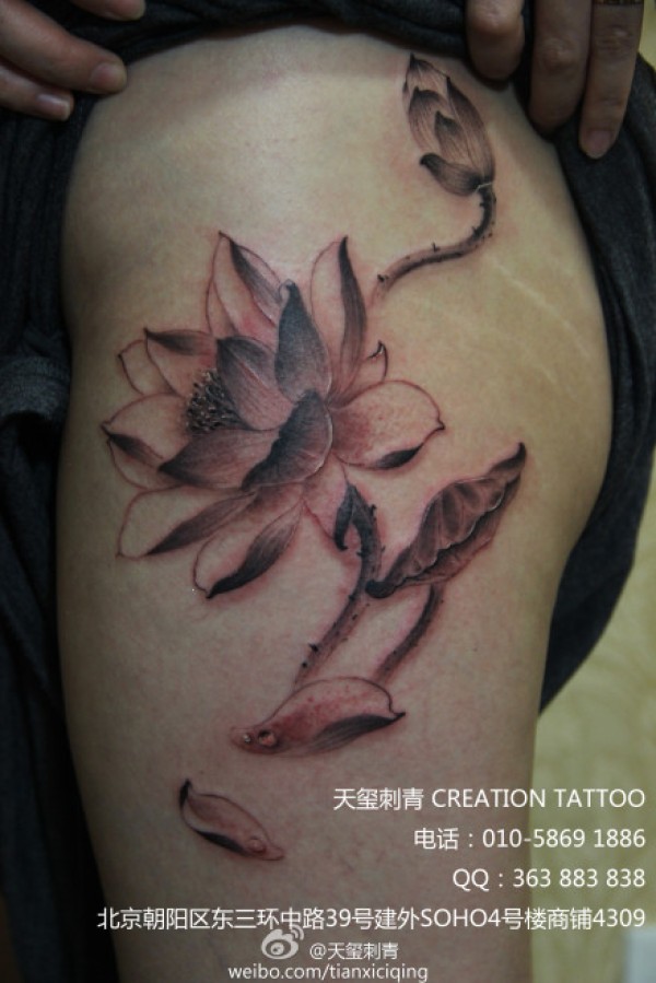 女生腿部唯美经典的水墨莲花纹身图案_女生纹身图案大全_纹身图吧