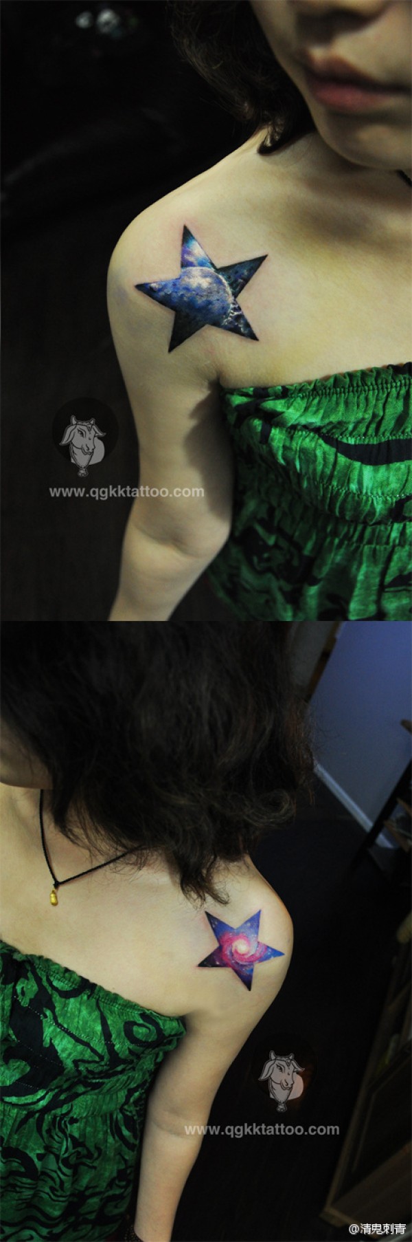 女生肩膀处漂亮的彩色星空五角星纹身图案_女生纹身图案大全_纹身图吧