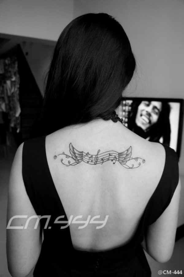 女生背部音符与小翅膀纹身图案_女生纹身图案大全_纹身图吧
