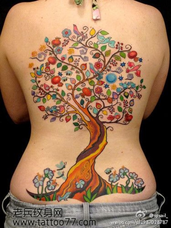 女生后背一款彩色糖果树纹身图案_女生纹身图案大全_纹身图吧