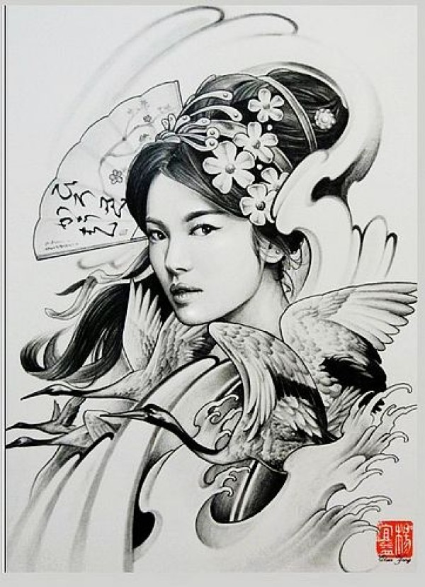 一款漂亮的适合纹半胛的美女仙鹤纹身图案图片_女生纹身图案大全_纹身图吧