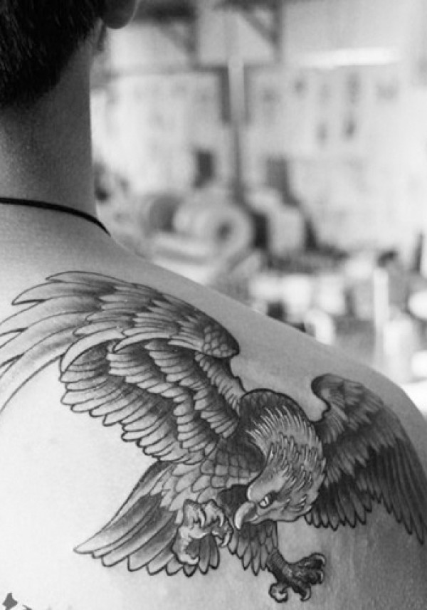 女生肩背帅气的黑白老鹰纹身图案_女生纹身图案大全_纹身图吧