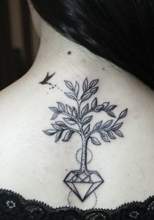 女生背部时尚的小树与小鸟纹身_女生纹身图案大全_纹身图吧