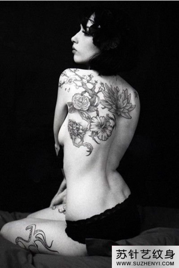 女生背上创意漂亮黑白花与树纹身_女生纹身图案大全_纹身图吧