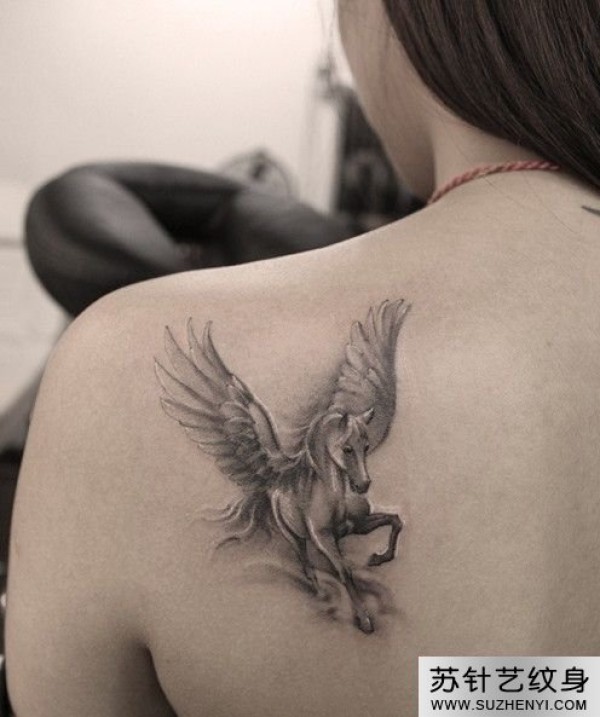 创意女生后背经典黑白天马纹身_女生纹身图案大全_纹身图吧