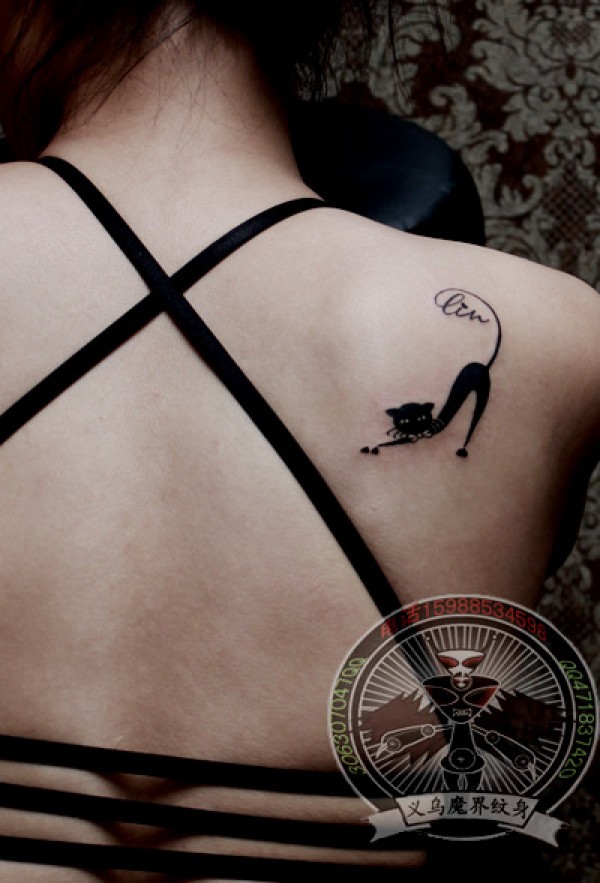 女生背部设计猫咪连体英文纹身_女生纹身图案大全_纹身图吧