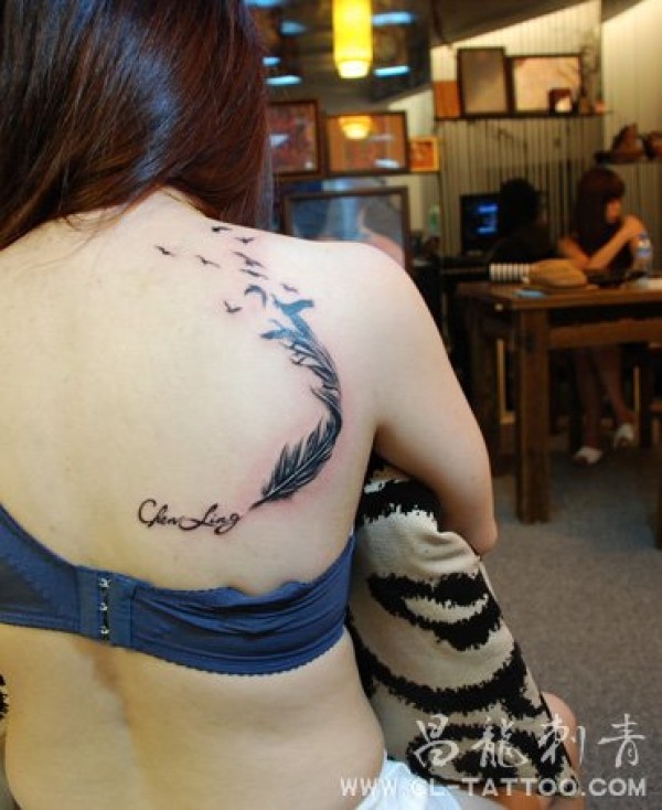 背部另类羽毛_女生黑白_女生纹身图案大全_纹身图吧
