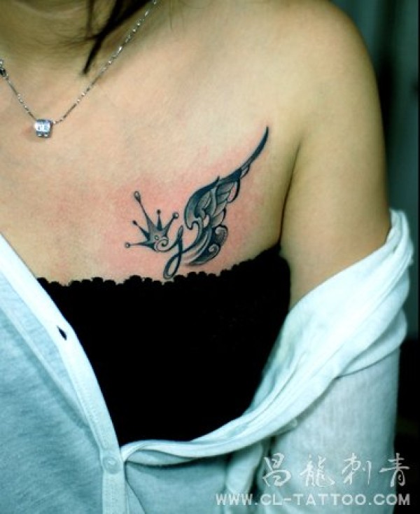 昌龙刺青设计个性皇冠与翅膀组合_女生黑白_女生纹身图案大全_纹身图吧