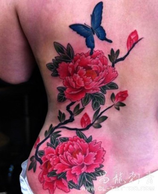 女士后背传统大牡丹刺青_女生彩色_女生纹身图案大全_纹身图吧