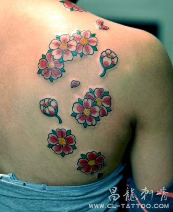 女士背部樱花_女生彩色_女生纹身图案大全_纹身图吧