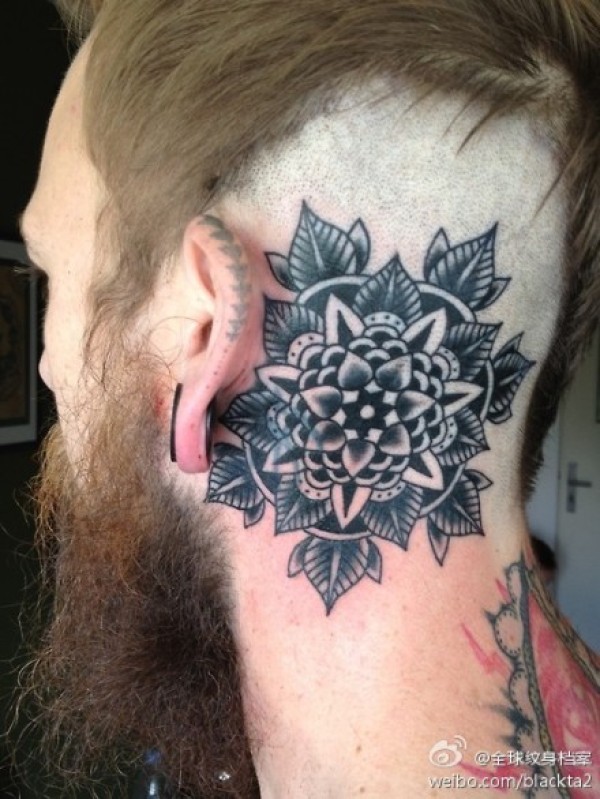 头部另类潮流的欧美黑灰花卉纹身图案_欧美纹身图案大全_纹身图吧