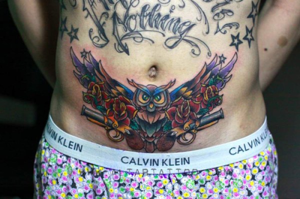 男生腹部欧美风格的猫头鹰与手枪纹身图案_欧美纹身图案大全_纹身图吧