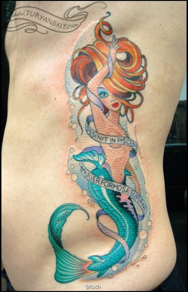 侧腰一款欧美风格美人鱼纹身图案_欧美纹身图案大全_纹身图吧