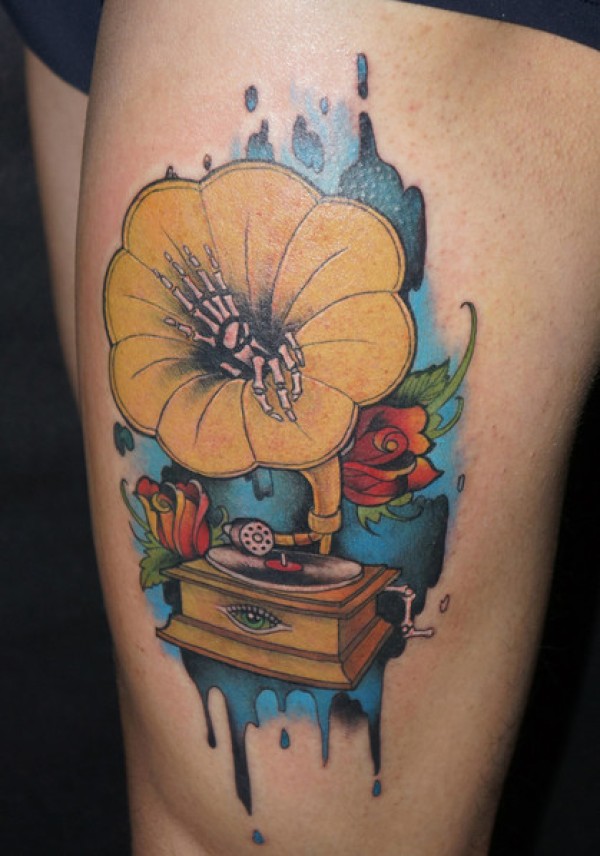 欧美彩色留声机纹身_欧美纹身图案大全_纹身图吧