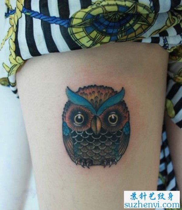 腿部欧美风格猫头鹰纹身_欧美纹身图案大全_纹身图吧