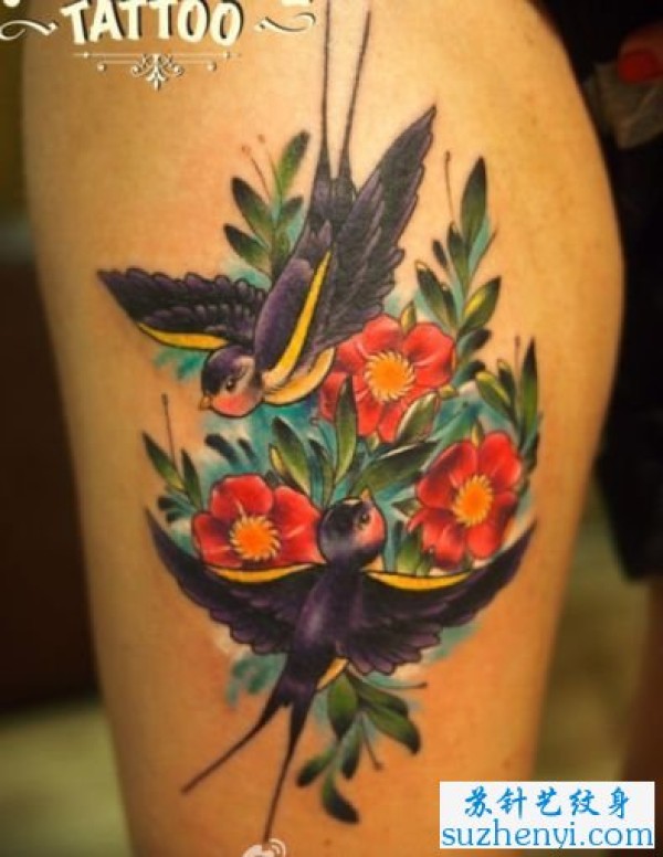 欧美风格小燕子樱花纹身_欧美纹身图案大全_纹身图吧