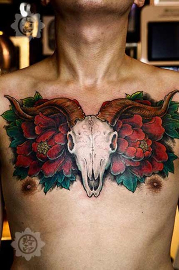欧美彩色花胸羊头纹身_欧美纹身图案大全_纹身图吧