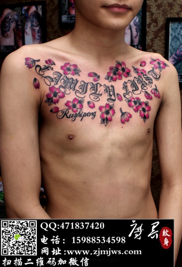 欧美胸部超霸气英文樱花纹身_欧美纹身图案大全_纹身图吧