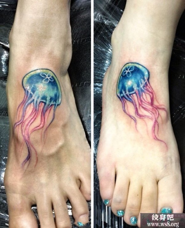 情侣脚背上的创意水母chuangyishuimu刺青_情侣纹身图案大全_纹身图吧