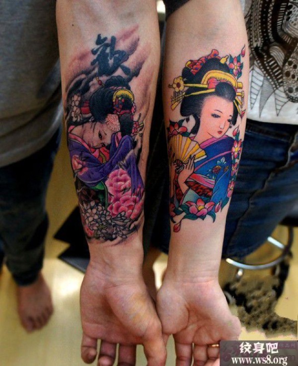 手臂内侧的情侣艺伎美女yijimeinv图案_情侣纹身图案大全_纹身图吧