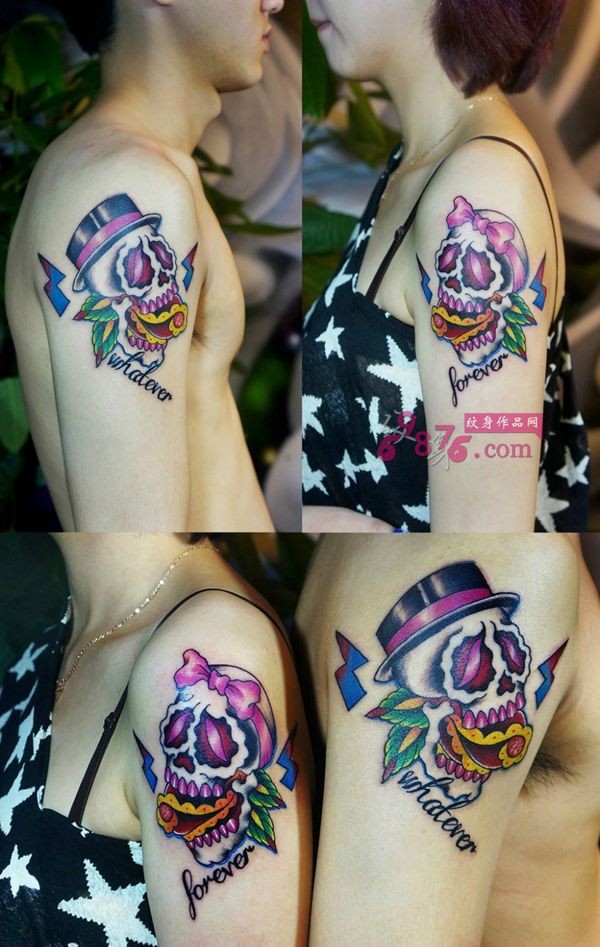 个性情侣彩色骷髅手臂纹身_情侣纹身图案大全_纹身图吧