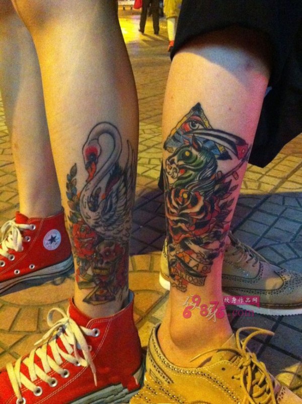 情侣天鹅与马花小腿纹身_情侣纹身图案大全_纹身图吧