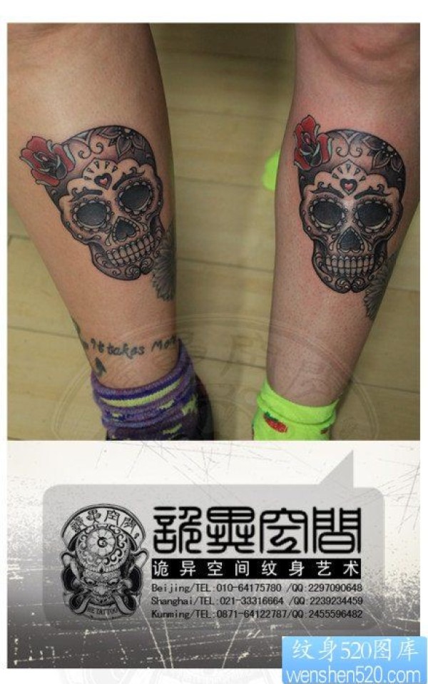 腿部时尚超酷的情侣欧美花骷髅纹身图片_情侣纹身图案大全_纹身图吧
