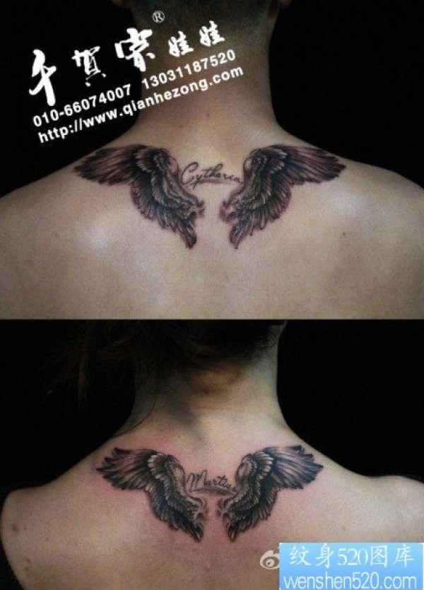 后颈部时尚精美的情侣黑白翅膀纹身图片_情侣纹身图案大全_纹身图吧