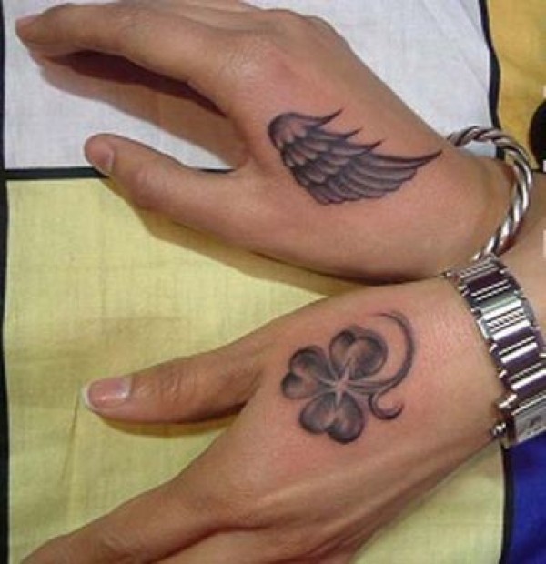 手部情侣翅膀三叶草纹身图片_情侣纹身图案大全_纹身图吧