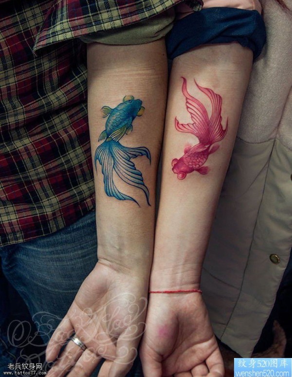 手臂情侣彩色金鱼纹身图片_情侣纹身图案大全_纹身图吧