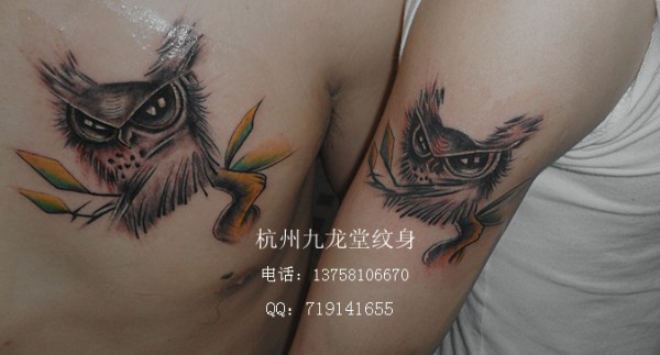 猫头鹰图案情侣纹身作品男士纹在胸口,女生纹_情侣纹身图案大全_纹身图吧