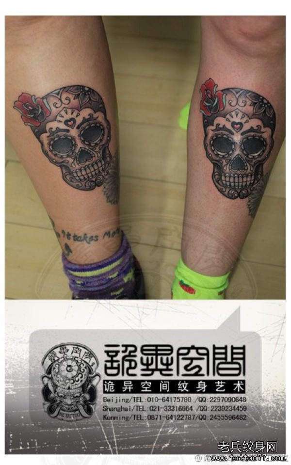 腿部潮流超酷的情侣欧美花骷髅纹身图案_情侣纹身图案大全_纹身图吧