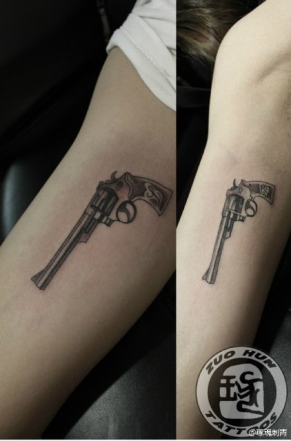 手臂潮流经典的一款情侣手枪纹身图案_情侣纹身图案大全_纹身图吧