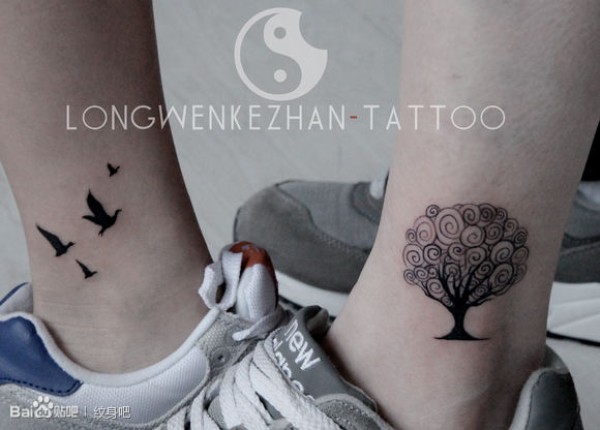 脚踝处情侣小树与小鸟纹身图案_情侣纹身图案大全_纹身图吧