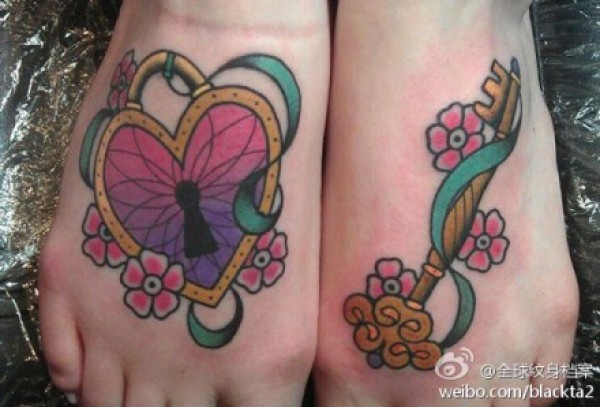 脚背漂亮时尚的情侣爱心锁与钥匙纹身图案_情侣纹身图案大全_纹身图吧