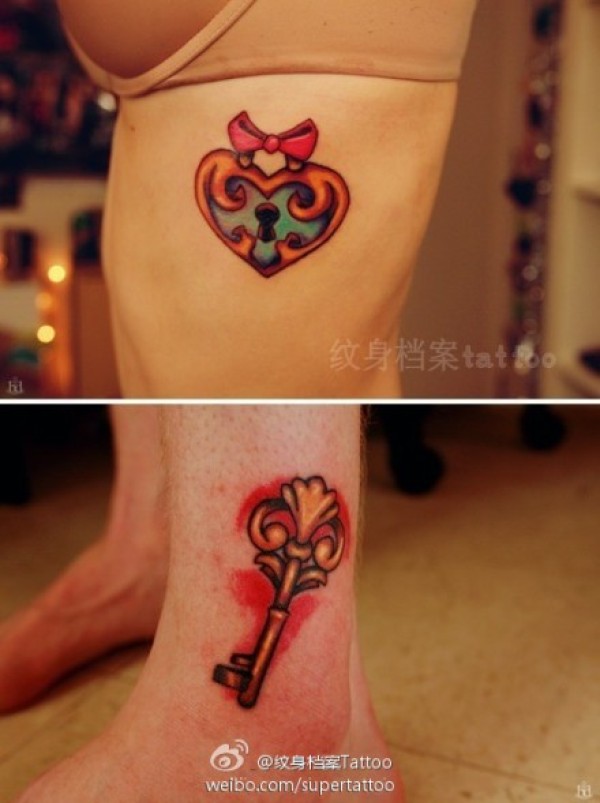 腿部情侣钥匙爱心锁纹身_情侣纹身图案大全_纹身图吧